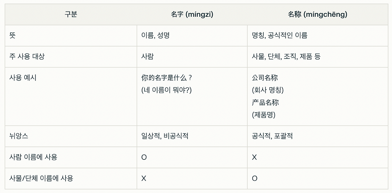 요약하면, 名字는 "사람의 이름", 名称은 "사물·단체·직위 등의 공식 명칭"에 주로 쓰이며, 의미와 사용 범위에 차이가 있습니다.