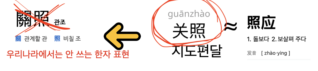 첫 번째는 '关照'인데, 请多关照 형태로 외우면 좋을 듯합니다. 더불어 발음을 따라 하려면 파파고 링크 형태 보관이 더 유용하겠네요. 한자를 그냥 우리말 음으로 읽으면 '관조'인데, 제가 아는 관조(觀照)가 아닙니다. 한국말로는 쓰지 않는 한자 조합입니다.