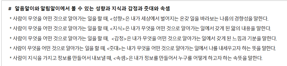 이제는 하단부의 두 개 영역을 살펴봅니다. 먼저 등장하는 내용은 지식과 정보의 바탕에 존재하는 성향, 지식, 감정, 줏대, 속셈에 대한 풀이입니다.