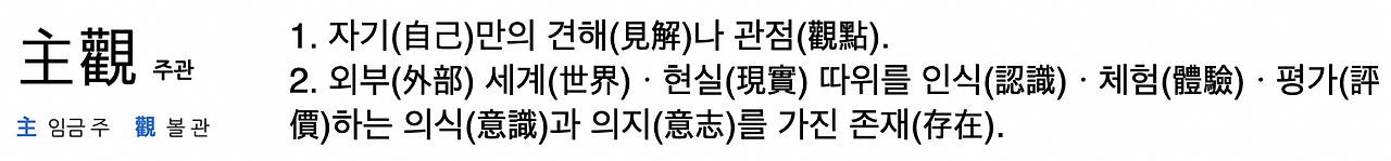 사람들은 저마다 갖고 있는 사람됨의 줏대를 주관(主觀)이라고 말해왔다. 사람들은 줏대가 있는 사람을 ‘주관이 있는 사람’, ‘주관이 또렷한 사람’, ‘주관을 가진 사람’으로 말한다. 사람은 나름의 줏대를 가짐으로써 ‘나’라는 임자로 설 수 있다. 사람은 나름의 줏대를 펼쳐나가는 일을 통해서 ‘나’라는 임자가 무엇을 하는 누구인지 또렷이 알아보게 된다. 사람은 누구나 나름의 줏대를 좇아서 줏대가 있는 사람으로 살아가고 싶어 한다.