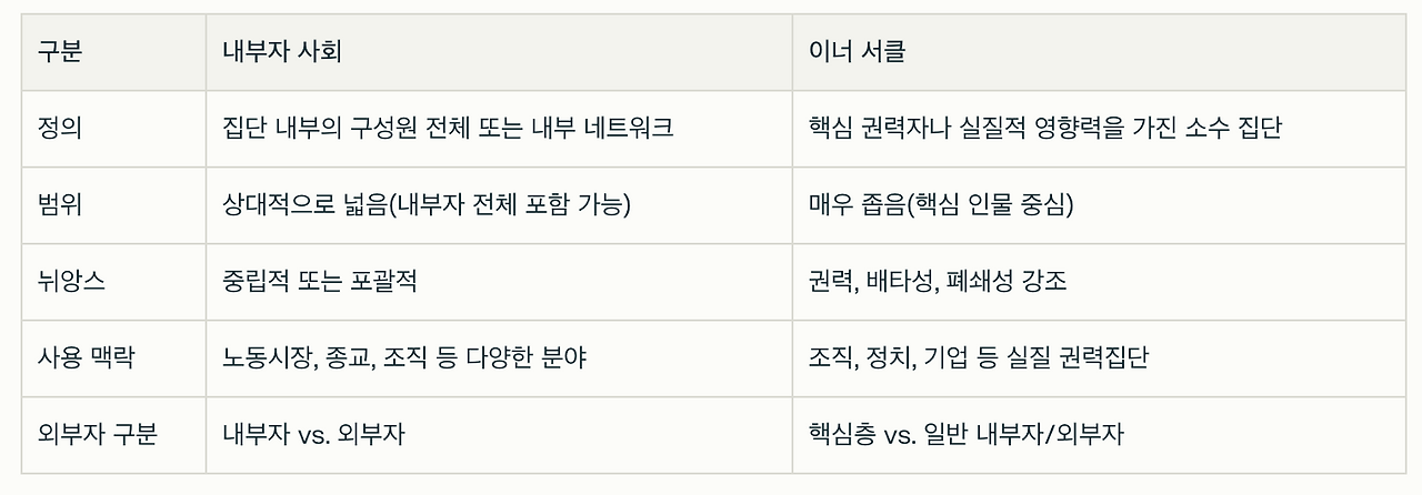 저자는 이를 '텃세'와 비슷한 '내부자 사회'라는 말로 표현합니다. 생소한 표현이라 AI 챗봇 '퍼플렉시티'에 그 의미를 물어보았습니다. '이너 서클'과의 차이점도 함께 질문했습니다.