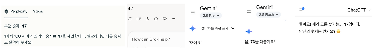 별의미는 없지만 재미 삼아 저도 따라 몇 차례 물어보았습니다. 우연이겠으나 Grok만 첫 번째에 42를 말합니다.