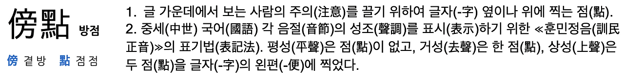 [2] 방점(傍點) 사전 풀이는 두 가지입니다. 제 글에서는 첫 번째 뜻으로 썼는데, 사전을 보니 두 번째 뜻에 눈이 가서 그 기원 풀이를 처음으로 보게 되었습니다.
