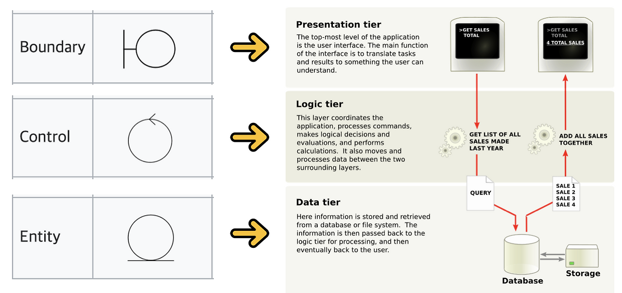 2000년대 객체지향 프로젝트를 떠올려 보면 객체의 식별에 대해서는 ECB 패턴이, 웹 계층에 대해서는 3 계층 아키텍처 패턴이 사실상 표준으로 쓰였습니다. 이 둘을 대응시켜 보면 거의 일대일대응이 가능해 쉽고 명확하게 받아들일 수 있는 기준이 됩니다.