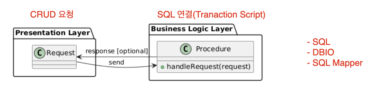 3 계층 아키텍처 패턴에 Transaction Script 방식을 도입하면 아주 명쾌한 프로그램 배열 규칙을 만들 수 있습니다. 우리나라 환경에 맞춰 약간의 코멘트를 덧붙이면 명쾌하게 과거에 대유행했던 방식을 담아낼 수 있습니다. 여기에는 관계형 데이터베이스의 지배적인 위상을 전제로 합니다. 어쩌면 자바 언어의 인기도 관계형 데이터베이스의 보급과 더불어 JDBC 기술을 이용한 강력한 연동이 시너지로 작동했을 가능성이 높습니다.