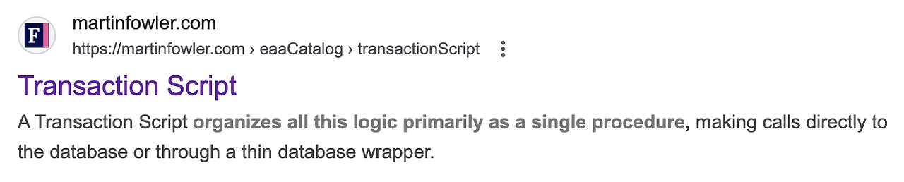 그런 빈 틈을 이용해 널리 유행한 프로그래밍 패턴이 마틴 파울러가 명명한 Transaction Script입니다.