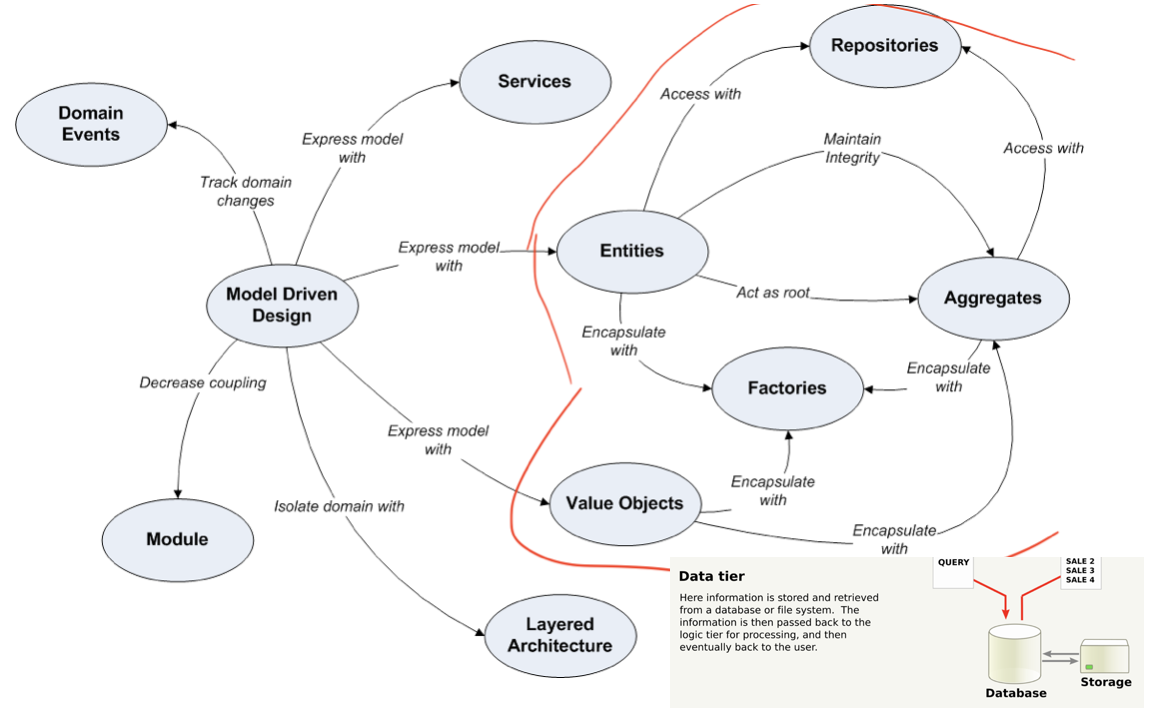 제가 앞서 데이터 계층과 연관된 요소를 붉은색으로 표기한 것은 기능적 종속성을 표현한 것입니다. 다시 말해, 위에서 녹색 테투리 칠한 빌딩 블록 중에서 도메인 이벤트와 서비스를 제외한 나머지는 영속성(Persistence) 문제와 관련이 있다는 말입니다. 그러나, 이를 다른 계층의 문제로 격리하자는 것이 DDD 접근의 특징입니다.