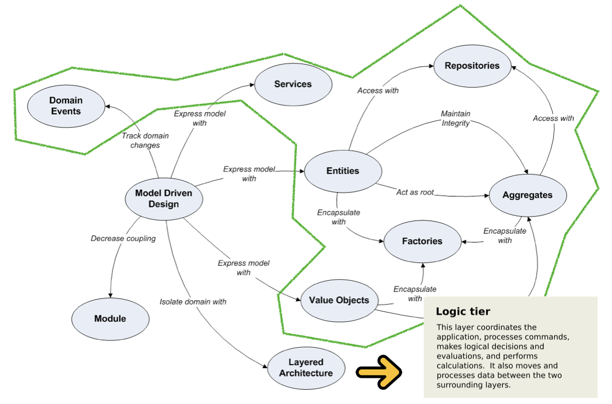 하지만, 위 그림은 오해의 소지가 있습니다. DDD는 모델 주도의 설계를 하는데, 이에 따르면 Layered Architecture에 따라 도메인 계층을 다른 층과 구분합니다. 그리하여 기존의 3 계층 아키텍처 패턴에 대응시키면 로직 계층 부분을 도메인 계층으로 구성하는 전략을 취한다고 할 수 있습니다. 그렇게 되면 빌딩 블록 전부가 로직 계층에 존재하게 되죠.