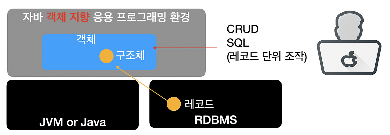 그래서, 다음 그림과 같이 객체나 구조체를 조작할 때, RDBMS에 특화된 명령어에 해당하는 SQL을 사용하게 됩니다.