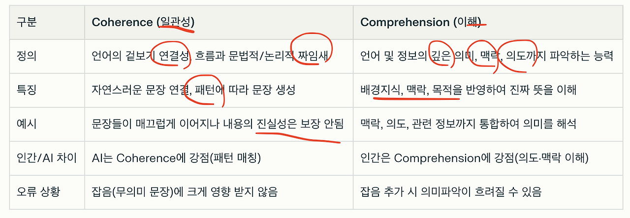Knowing은 외형상의 정보 습득, Understanding은 그 정보를 넘어서 이유, 맥락, 원리까지 진짜로 파악하는 능력이라는 명확한 차이가 있습니다. AI와 인간의 가장 큰 차이점 중 하나가 바로 이 지점에 있습니다.