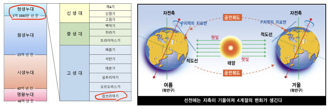 위 인용문을 보며 '왜, 굳이 5억 년 전인가?' 물었다가 퍼플렉시티를 통해 그 이유를 파악합니다. 현생누대는 캄브리아기 대폭발[1]을 시작점으로 두기 때문인데요. 한편, 캄브리아라는 이름은 웨일스 지방의 고생물 화석과 침전암 지층을 연구에서 발견한 것이라 웨일스의 라틴어에서 유래한 것입니다.