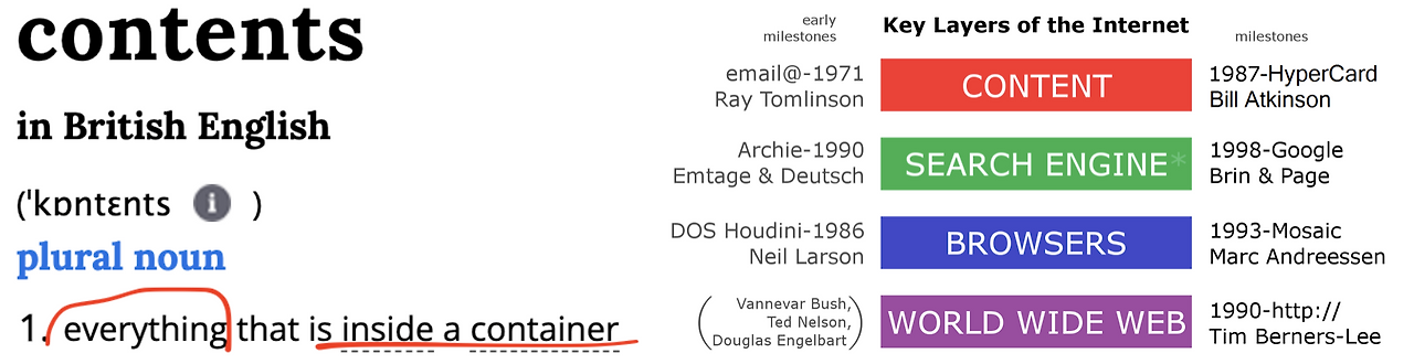그렇지만, 나름의 조사를 한 후에 시간이 흘러 숙성된 제 생각 위에 당시 봤던 콜린스 사전의 정의 즉, everything that is inside a container가 다시 해석됩니다. 웹 기술 위에서는 모든 것이 콘텐츠가 될 수 있다고. 그리고, <코드 범람의 시대, 데이터 희소의 시대에서 개인의 기회>에서 인용한 다음 글귀를 읽던 때를 떠올리게 합니다.