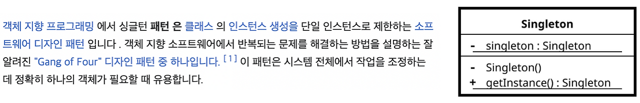 이번에는 정반대에 가까운 싱글톤(Singleton) 패턴을 보겠습니다. 단 하나의 인스턴스만 존재하게 하는 객체지향 프로그래밍 패턴입니다.