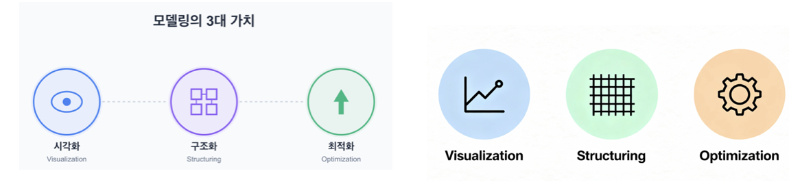 모델링의 3대 가치를 시각화, 구조화, 최적화로 표현하고 싶어요. 간결한 이미지로 이를 그려 주세요.