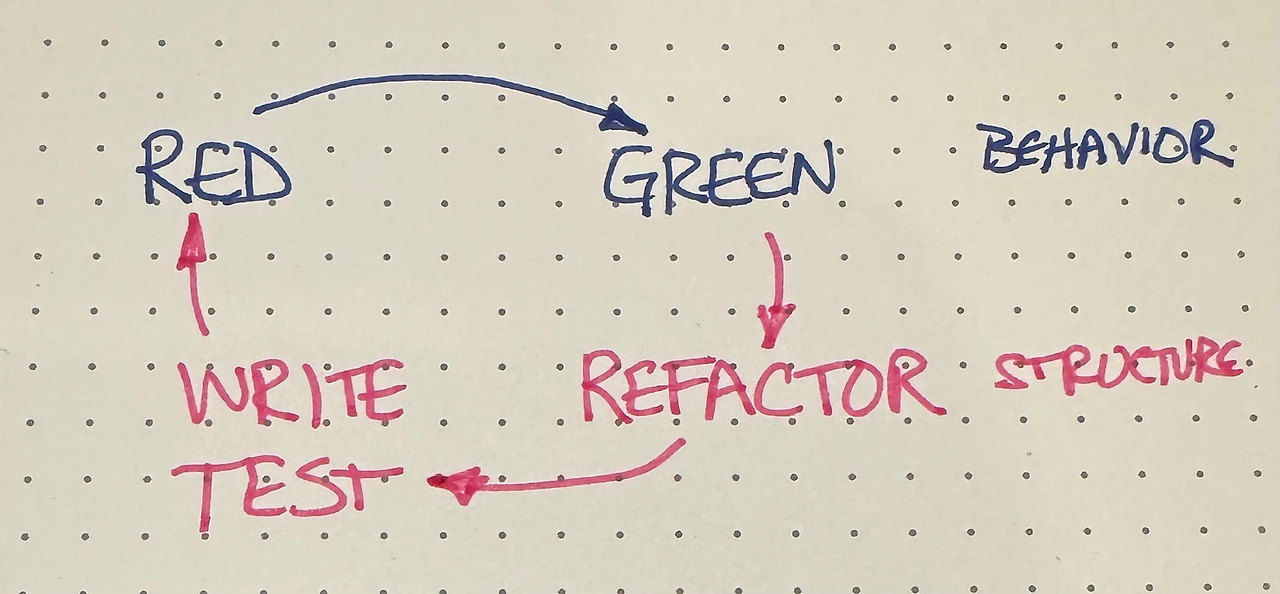 저는 TDD도 설계 방법으로 볼 수 있다고 생각합니다. 다만, 기능 중심적인 설계로는 실용적이지만, 구조 설계에 대해서는 리팩터링이라는 절차만 있어 부족함이 있다[2]는 것이 제 생각입니다. Kent Beck이 그린 그림을 인용하면 붉은색 영어이 구조 설계 부분인데, 구체적인 방법론이 제시되어 있지 않아 모호할 수 있습니다.