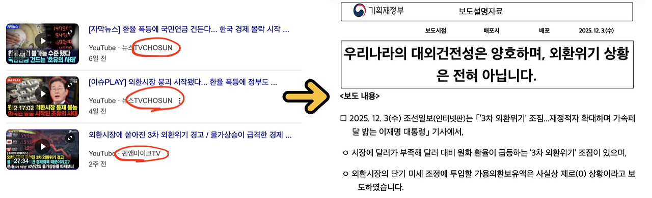 의혹은 하루 만에 매불쇼 영상 몇 분 보는 것으로 확인이 되었습니다. 편집 영상의 제목에 바로 답이 있습니다. <나라 망하라고 최선을 다해 기도하는 언론!> 이어서 '환율 1500' 구글링을 해 보았습니다. 예상대로 '재래식 언론'의 대표 주자들이 눈에 띄었습니다. 구글 결과 중에는 재래식 언론의 선동에 반박하는 정부의 공식 보도 자료가 있습니다.