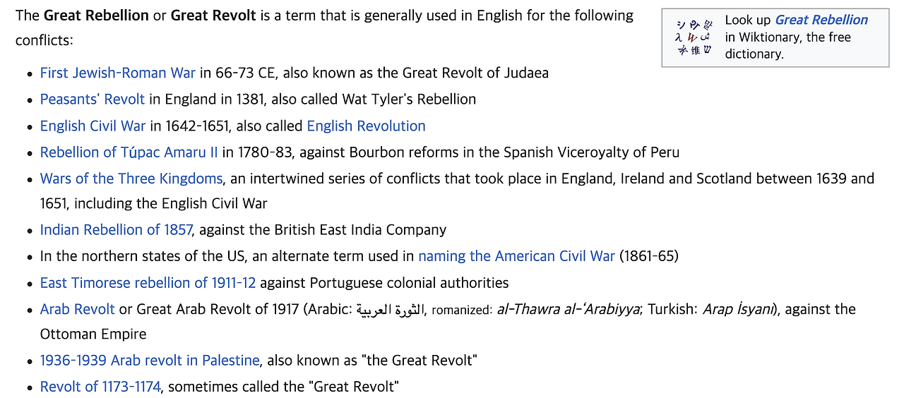 더불어 위키피디아 대반란 목록에 없는 것을 보면 '세계사'로 뭉뚱그렸을 때는 그 의미가 크지 않은 듯합니다. 저자가 보는 관점이 그만큼 세계사에 대한 일반적 시각과 다르다고도 할 수 있겠습니다.