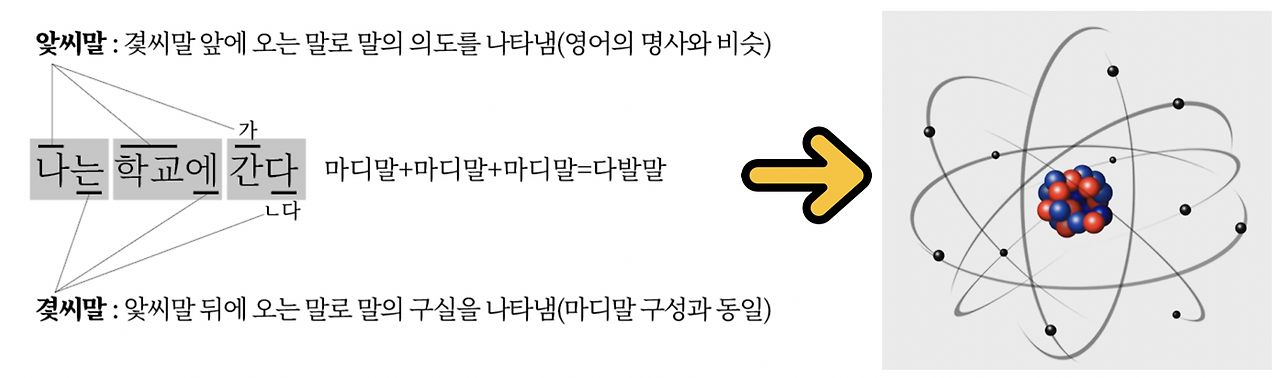 꼴이름과 결이룸의 이분법입니다. 일단, 꼴과 결을 따지기 전에 '씨말'을 처음 배울 때가 떠오릅니다. 제 글 <한국말은 어떻게 나눠지는가?>를 찾아보니 2023년이었네요. 씨말은 앛씨말과 겿씨말이 마치 원자의 이원성 구조를 떠오르게 했었죠. 어쩐지 꼴과 결의 구분도 비슷할 듯합니다.