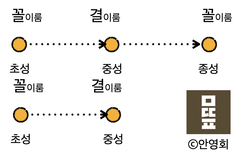 중성으로 쓰이는 씨소리가 바로 결이룸 씨소리네요. 결[1]은 흐름을 전제로 하니 꼴이룸 씨소리로 시작이 된 후에 어어지는 것이겠구나 짐작할 수 있습니다. 그렇게 결론을 지으려 하니 'ㅇ(이응)'은 어떻게 해석해야 하나 궁금증이 생깁니다.