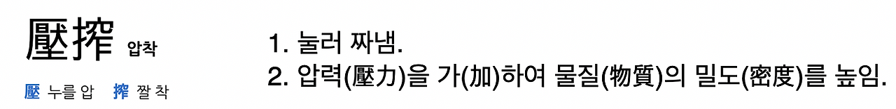하지만, 여기서 이러한 작명의 변화 과정에서 발생하는 일종의 '압착' 현상으로 관심이 옮겨 갔습니다. 잘 쓰지 않는 압착이란 말을 쓰게 된 바탕에는 최근에 두 아들과 포스코(포항제철) 견학을 다녀온 영향이 작용한 듯합니다. <낱말의 뜻을 깊고 넓게 묻고 따지는 일의 소중함> 실천으로 한자사전을 찾아봅니다.