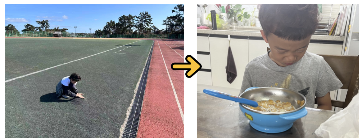 또 다른 에피소드를 추가합니다. 요즘 가족 모두 마라톤 경기에 참여하기로 하면서 트랙이 있는 경기장에서 연습을 하고 있습니다. 큰아이는 3km를 뛰고 나서 인조잔디 구장에 놓인 충진재를 쌓으며 놀고 있었습니다. 5km를 뛴 저는 큰아이를 보면서 '손을 씻어야 한다'는 잔소리를 떠올렸습니다. 그러고 나서 '이따 손 씻어야 돼'라고 말하는 대신에 다음과 같이 말했습니다.