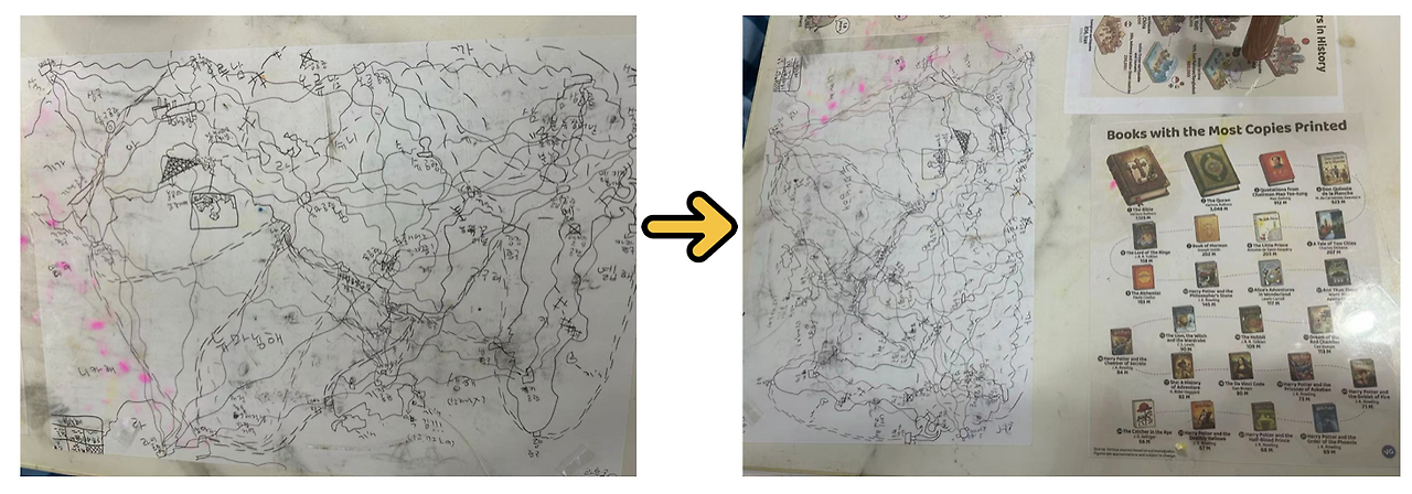 그렇게 지도를 그리고 나더니 식탁 밑에 제가 넣어둔 출력물 두 개를 꺼내어 저에게 자신이 그린 지도로 교체하겠다고 말합니다. 양해를 구한 건지 그저 사실을 알리려는 건지 의도는 모르겠으나 뿌듯함을 느꼈습니다.