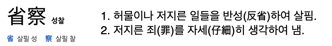 그리고 마지막 구절에서 '성찰'이라는 단어가 부각됩니다. 과거에 지인이 '성찰을 하는 리더와 그렇지 않은 사람'을 구분해서 설명한 일이 있어서 그런 듯합니다. 성찰이라는 낱말을 씨말을 드러내 바라보니 '어두운 면에 대한 직시'가 보입니다.