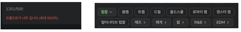 두 번째로 소개한 MusicCreator AI를 열어서 대뜸 프롬프트부터 복사해서 넣었습니다. 이번에는 500자 제한이 있었습니다. 그에 맞추느라 반 넘는 문자를 날려야 했습니다. 그 과정에서 아이 눈에는 보이고 제 눈에는 안 보였던 퍼플렉시티의 허술한 목록이 눈에 띄었습니다. 실제로 쓸 만한 노래를 만들 생각이라면 가사도 상당히 손을 봐야 한다는 사실을 확인할 수 있었습니다.