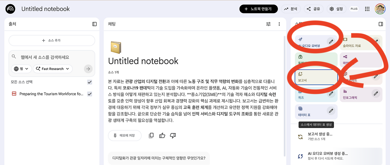습관적으로 행동이 나갔는데, 여기서 조금 더 전략적으로 생각하고 행동[1]하기로 합니다. 즉각적으로 구글 노트북LM을 켠 후에 팟캐스트를 만듭니다. 평소 뉴스처럼 듣는 습관을 재활용한 것인데요. 이번에는 거기에 더하여 '보고서' 생성 메뉴를 눌렀습니다.