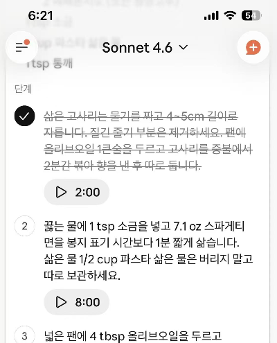 정반대로 상쾌한 UX 경험을 하나 소개합니다. AI 서비스가 채팅에서 컨텍스트로, 다시 하네스로 나아가면서 환경 인식에 대해 정교해지는 흔적이 보이는 듯한 경험도 있습니다. 4월 제주도는 고사리가 한창인데요. 아내가 딴 고사리로 파스타를 만들어 달라고 해서 클로드에 레시피를 요구하고 만난 UI 입니다. 채팅으로 접근했으나 체크 리스트 형태로도 작동합니다.