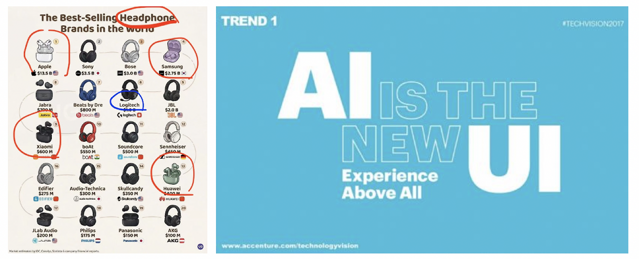 <인공지능이 가져올 궁극의 사용자 인터페이스 혁명>에 첨부한 이미지 중에는 액센추어가 만든 문구인 "AI is the new UI"가 있습니다. 그런데, AI만으로는 인터페이스가 만들어지지 않습니다. 사람과 소통하려면 반드시 감각기관과 연동할 수 있는 인터페이스 혹은 어떤 물질(혹은 기계)이 필요합니다. 헤드폰이 저에게 지난 글의 영감을 준 이유도 거기에 있습니다.