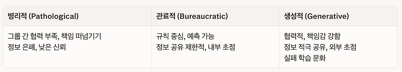 이스턴 미시건 대학교의 사회학자 론 웨스트럼Ron Westrum 교수는 조직들이 정보를 처리하는 프로세스를 설명하기 위해 표 3.1과 같은 세 가지 문화 모형을 개발했다.