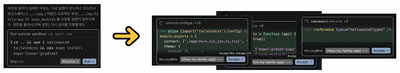 Cursor도 이제는 익숙해진 Chain of Thought 형태로 생각을 공유합니다. 인공지능 모델의 기본 작동 방식이 된 듯합니다. 그리고 알아서 실행을 하다가 제 판단이 필요할 때만 멈추어서 [Accept] 버튼 누르기를 기다립니다.