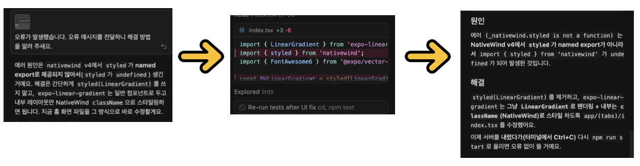 오류를 덤프 하여 이미지로 전달한 후에 다시 Cursor에게 도움을 청하니 계획을 설명하고 실행한 후에 원인과 해결 내용에 대한 보고까지 해 줍니다.