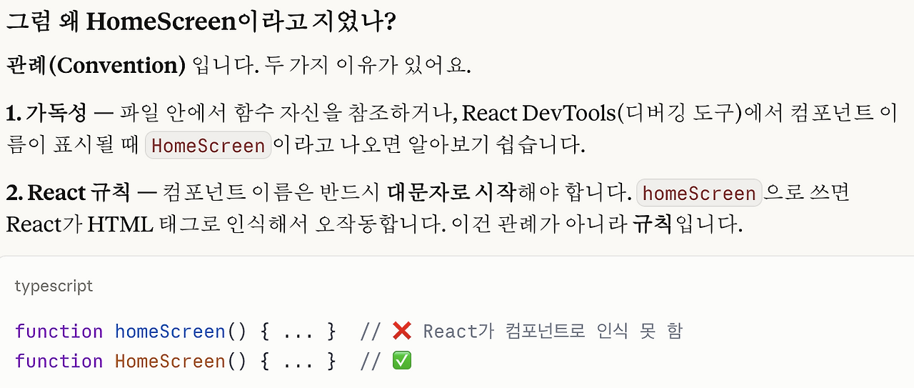 HomeScreen 함수의 이름은 고정된 건가요? 관례인가요? 아니면 어딘가 정의되어서 호출된 것인가요?