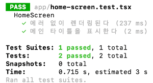 지금 쓰지 않는 app/index.tsx를 지우고, 그걸 테스트하던 index.test.tsx는 새 홈 화면((tabs)/index.tsx)을 검사하는 테스트로 바꿔서 정리할게요. 그렇게 하면 불필요한 파일은 없어지고, npm test도 계속 통과합니다.