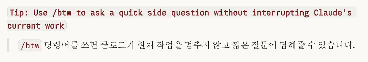 중간중간 자신이 하는 일을 알려주다가 저에게 결정을 하라고 요구합니다. 그 사이에 공백이 발생합니다. 모두 다 따라갈 수는 없기에 눈에 띄는 것들은 화면 덤프를 해서 클로드에게 어떤 내용인지 묻습니다. 그러다가 클로드 코드 실행 중에 질문을 답할 수 있는 방법을 팁으로 배웁니다.