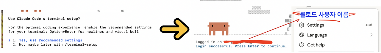 터미널 설정에 대해 묻길래 권장하는 대로 했더니 제 클로드 사용자 이름으로 로그인이 됩니다.