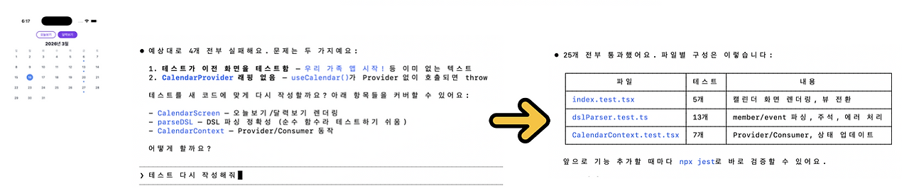 전환 경험은 '압도적으로 좋다'입니다. 딱히 적응이랄 것도 없이 몇 시간 만에 커서가 짠 코드를 클로드 앱이 제시한 아이디어를 더해서 구현을 완료했습니다. 그 과정에서 실행환경도 정비해서 그전에 존재를 몰라 설치를 못했던 맥에서 구동하는 아이폰 시뮬레이터도 설치하고, 테스트 코드도 모두 새로 작성하게 했습니다.