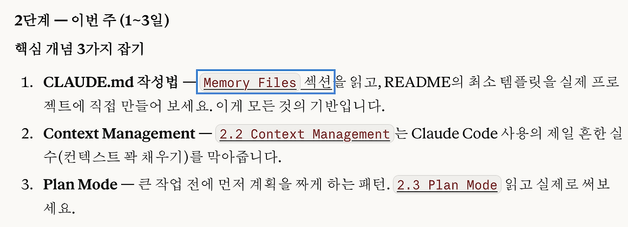 그 이후에 클로드가 제안한 2단계를 읽었습니다. 정확히 말하면 Claude Code Ultimate Guide를 클로드가 먼저 읽고 제시한 단계입니다. 하지만, 도구를 깊이 알다가는 바이브(혹은 동력)를 잃을 것 같아 학습은 멈추기로 합니다.