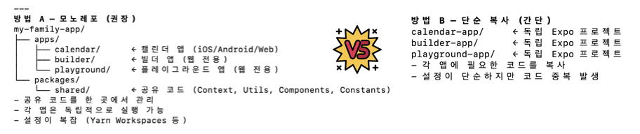 그래서 요구를 했더니 클로드 코드가 두 개의 옵션을 제시했고, 저는 권장으로 표기된 모노레포를 선택했습니다.