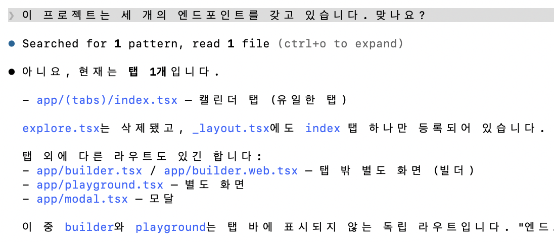 앞서 클로드 코드 첫 경험을 하고 나서 구상한 짜임새에 맞춰서 웹의 엔드포인트만 구분했었는데, 일단 현재 기술 스택 안에서는 앱의 탭과 화면에 대응되는 라우트route의 형태로 구현되어 있었습니다. 용어를 맞춰야지 했다가 다시 보니 앱으로 아예 구분하는 것이 제 관점을 적절히 투영한 구현이라는 생각이 들었습니다.