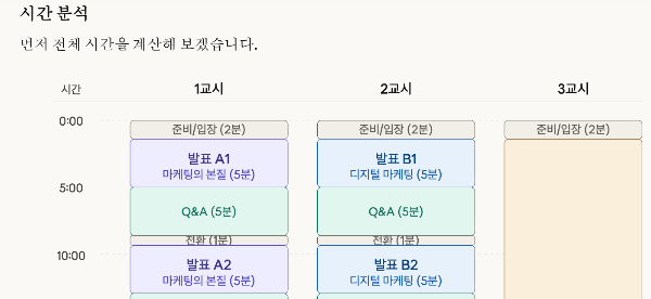 가장 먼저 눈에 띈 것은 다음과 같이 시각화해서 보여주는 클로드의 '시간 분석'이었습니다. 셋(나머지는 퍼플렉시티와 제미나이) 모두 시간 분석을 했지만, 도식圖式[2]에 대한 저의 선호選好가 확연하게 드러납니다.