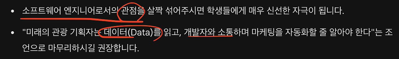 발표 이후의 비는 시간에 덧붙일 강의 내용에 대한 제안은 제미나이가 가장 나았습니다. 별도 주제로 강의를 묶어 주면서 시간 배분을 한 주제도 제시했습니다. 그에 반해 퍼플렉시티는 검색을 기반으로 하는 탓인지 인터넷에 공개된 수업 자료에 갇혀서 오래된 지식을 바탕으로 했습니다. 클로드 제안은 제미나이와 겨룰만했지만, 간결하게 묶어주는 구성 관점에서 제미나이가 마음에 들었습니다.