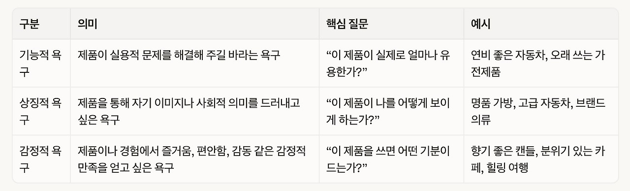 이렇게 되면서 제품이 충족시켜 주는 '기능적 욕구'의 중요성이 떨어지고 상징적 욕구나 감성적 욕구가 중요해지는 이른바 '초개인화 시대'가 온 것이죠.