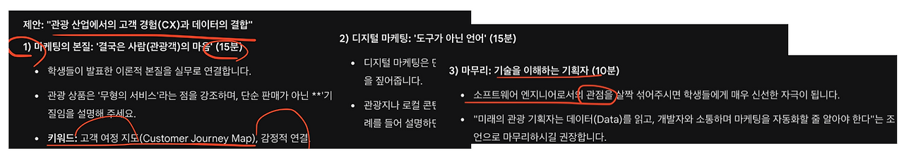 결과적으로 클로드가 제안한 시간표를 모델로 삼습니다. 변동성이 많은 발표 수업에서 민첩하게 임기응변을 발휘하기 위한 인식의 뼈대죠. 그러고 나서, 제미나이가 제시한 강의 주제에 관련한 조사를 해 둡니다. 여기에 더하여 클로드가 제시한 개념에 대해서도 마찬가지로 조사를 합니다.
