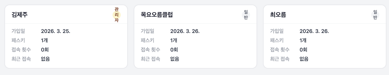 아내랑 같이 오름을 다니는 절친들이 사용자로 들어왔습니다. 그 과정에서 passkey 사용이 낯선 것인지 아니면, 클로드 코드가 모르는 시나리오로 들어오며 문제가 생긴 것인지 (저 빼고) 네 번째 사용자 초대 과정에서 문제가 생겼습니다.