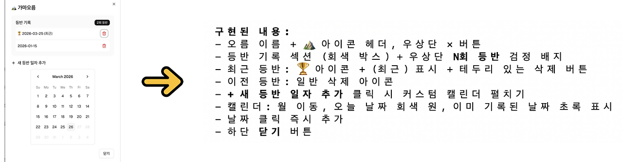 아내가 쓸 만하다고 느낀 다음에는 애정을 담기 시작했습니다. 오름 이름이 틀린 것을 찾아 저에게 모두 알려 주었습니다. 개발자(?)인 저 역시 아내가 쓰려는 모습을 보이자 등반 기록은 여러 날이 되어야 하는 것 아니냐고 제안했습니다. 아내는 동의하지만, 역설적으로 결혼 전에 웹 기획을 했던 터라 마치 자신이 해야 할 것 같았던 모양인지 귀찮아했습니다.