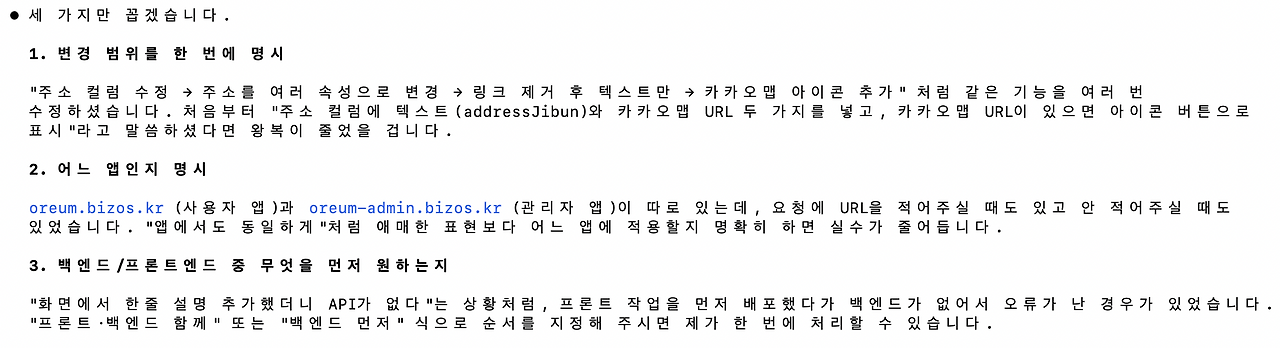 ❯ 지금까지 제가 작업을 요청하는 방식에 있어서 개선해야 할 사항이 있나요? 중요한 것만 골라서 제안을 주세요.