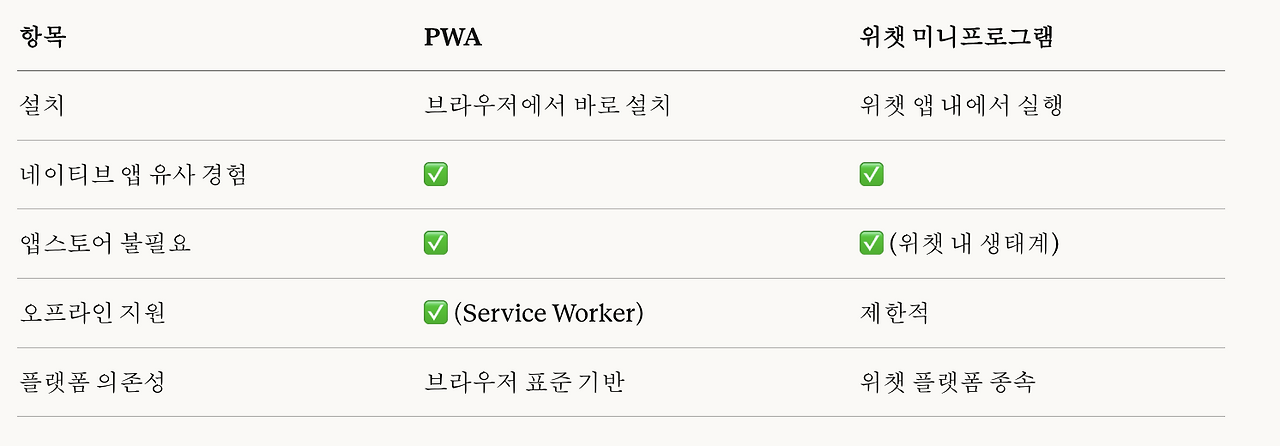 글을 쓰며 PWA와 위챗의 관계에 대해 클로드에게 물어서 요약한 표를 첨부합니다.